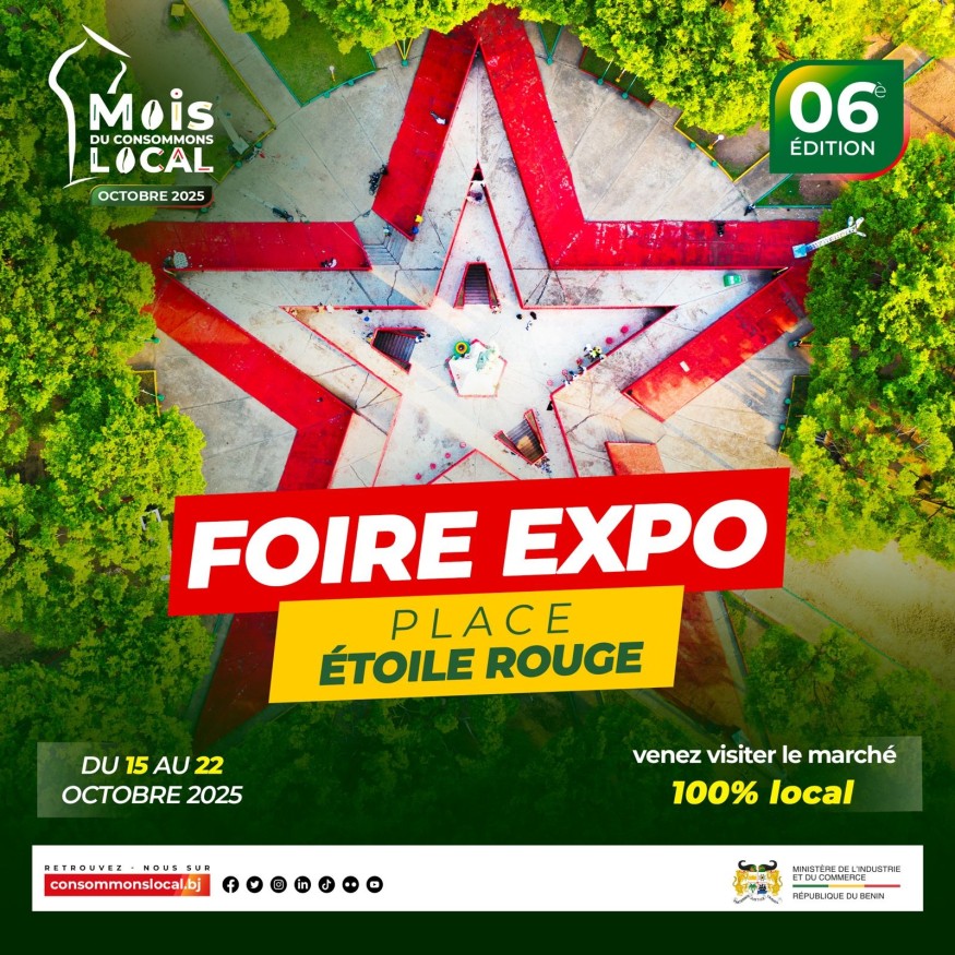 Du 15 au 22 octobre 2025, la Place de l’Étoile Rouge à Cotonou accueille la 6e édition du marché national d’exposition-vente des produits locaux. Une occasion unique de découvrir la richesse des savoir-faire béninois et de soutenir l’économie locale à travers une large gamme de produits « Made in Bénin ».