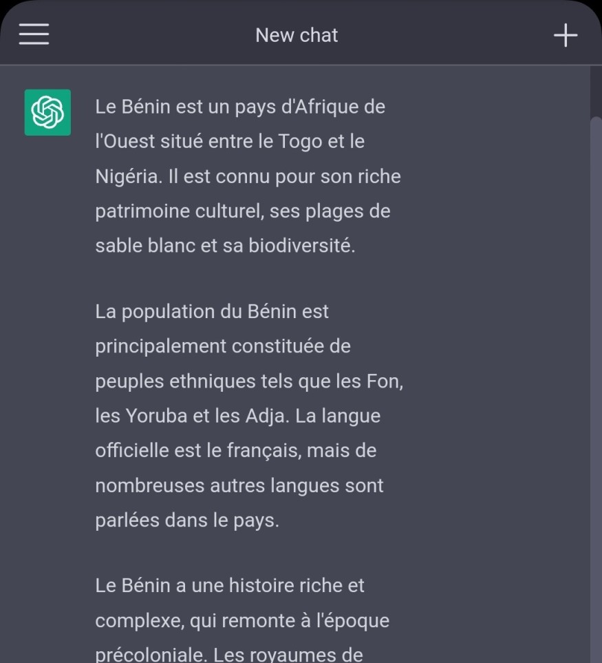 Vous avez entendu parlé de ChatGpt, ce modèle de langage entraîné basé sur l'intelligence artificielle développée par OpenAI ? Nous avons voulu voir ce qu'il avait dans le ventre même si nous étions déjà assez conquis par la prouesse technologique que cet outil représentait déjà. Pour celà, nous lui avons donné une consigne : rédiger un article sur le Bénin. Et voici le résultat!
