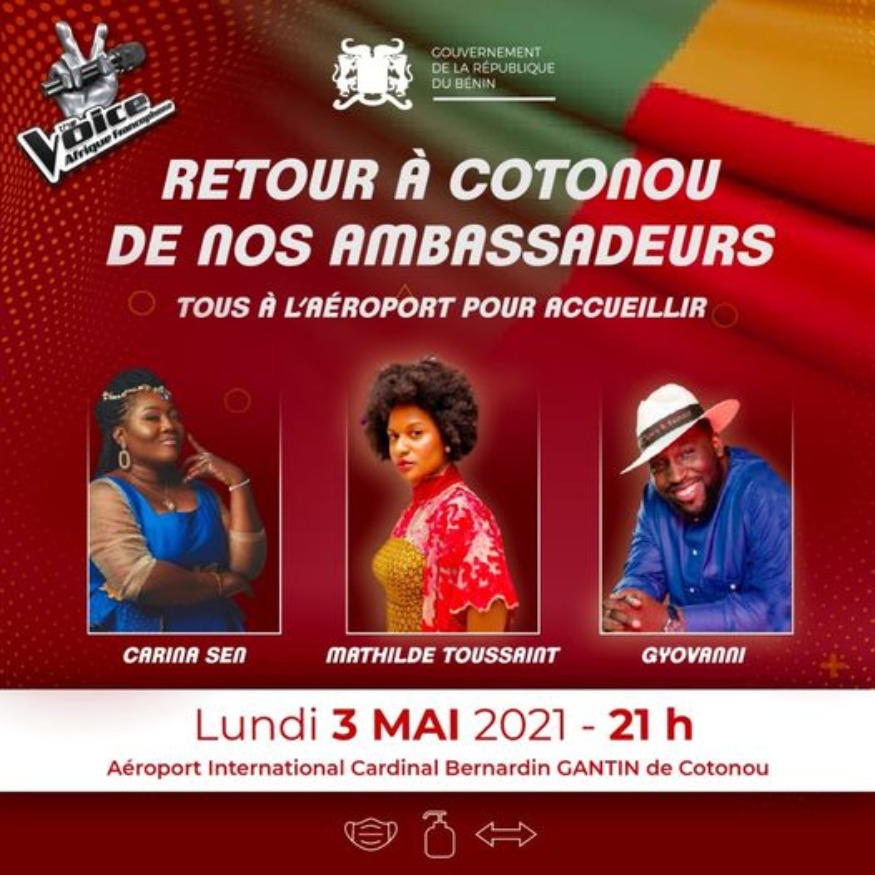 Avec Mathilde Toussaint au début ils étaient 3 à dignement représenter notre pays. La nuit du Samedi 01 mai 2021, nos 2 candidats en lice pour la finale de The voice Afrique francophone ont tenu en haleine tout un peuple. GYOVANNI ou Carina Sen n'auront pas ramené le trophée à la maison mais qu'est ce qu'on aime ce Bénin qui rend les rêves possibles!