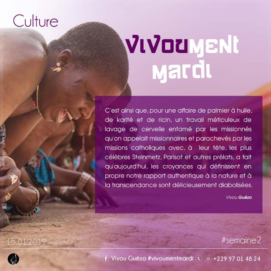 " C'est ainsi que pour une affaire de palmier à huile, de karité et de ricin, un travail méticuleux de lavage de cervelle entamé par les missionnés qu'on appelait missionnaires et parachevés par les missions catholiques avec, à leur tête, les plus célèbres Steinmetz, Parisot et autres prélats, a fait qu'aujourd'hui, les croyances qui définissent en propre notre rapport authentique à la nature et à la transcendance sont délicieusement diabolisées."