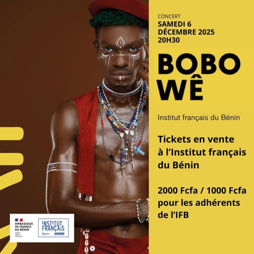 Ce samedi 6 décembre 2025 à 20h30, l’Institut français du Bénin accueillera un concert exceptionnel de l’artiste béninois Bobo Wê, une figure incontournable de la scène musicale locale.